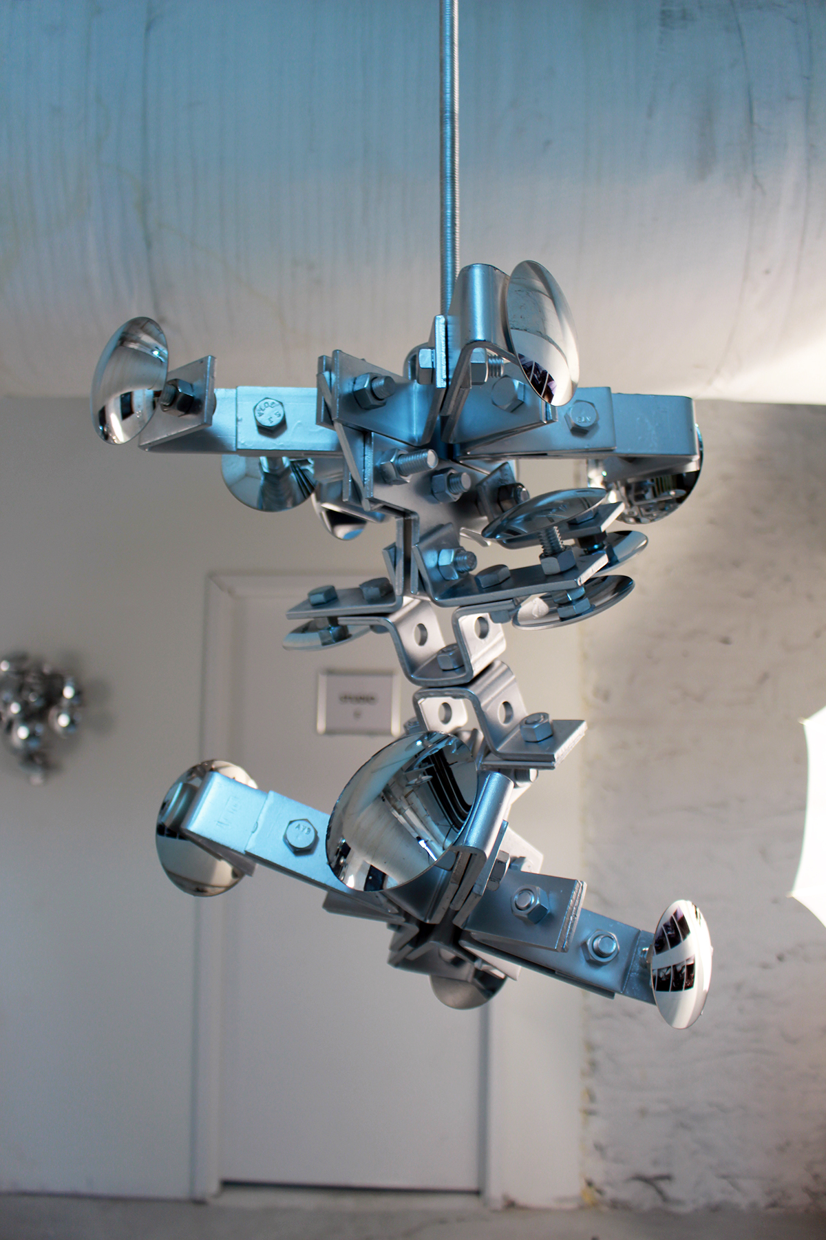 Measure of Dispersion (2014-ongoing) is a series of sculptural installations that aim to amplify and manipulate the spectator’s field of vision. Made from concave and convex mirrors of many sizes that Prado attaches to industrial metal structures, the sculptures create something akin to an anti-camera that reconfigures the viewer’s vantage point and amplifies notions of (dis)location.